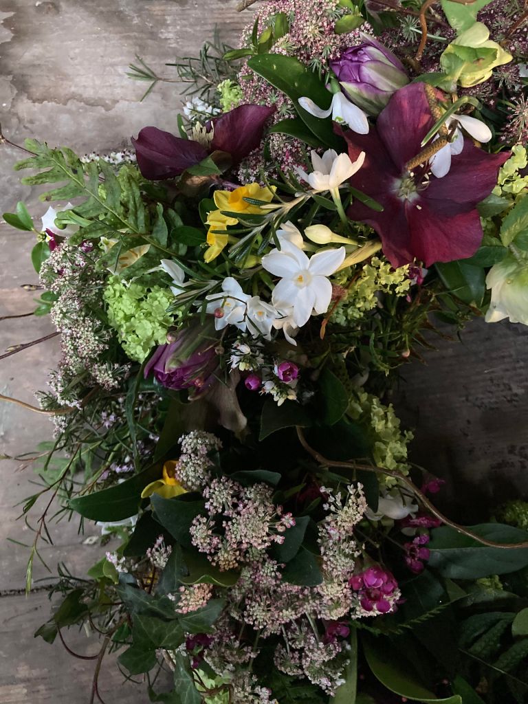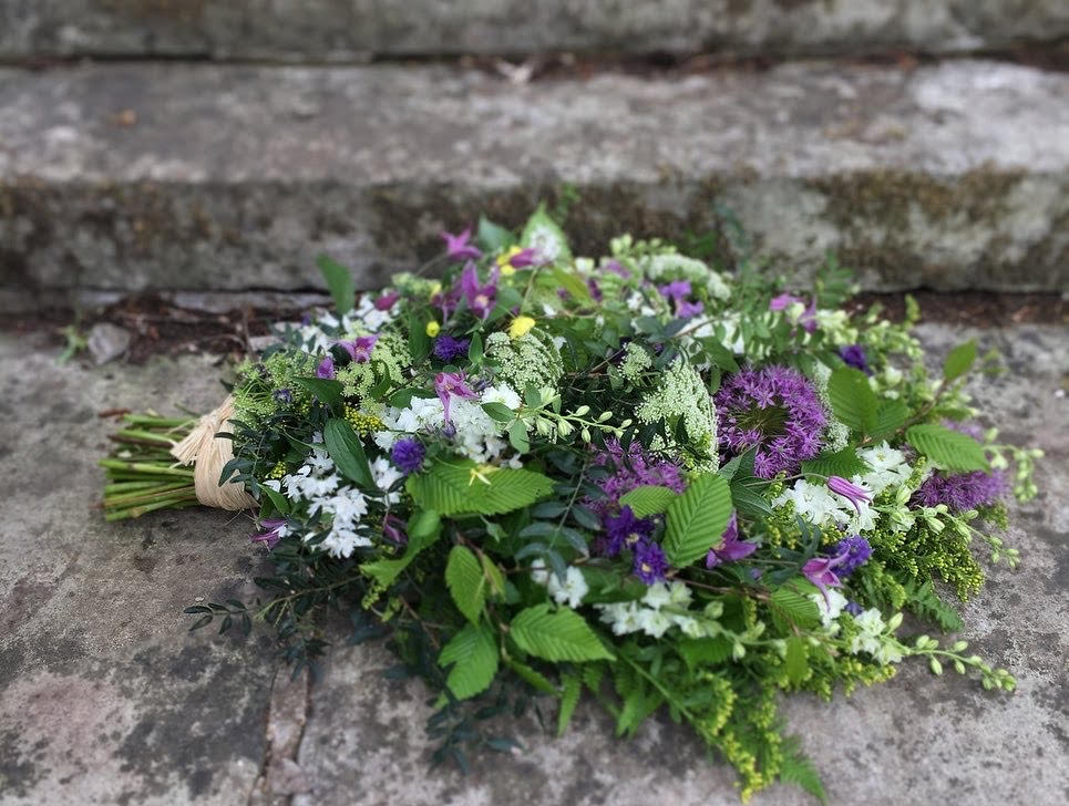I try to incorporate elements that are of personal significance to the deceased or the family wherever possible. This might include wildflowers, tree foliage or certain colours for example. (Please note all wildflowers are grown at the garden site).